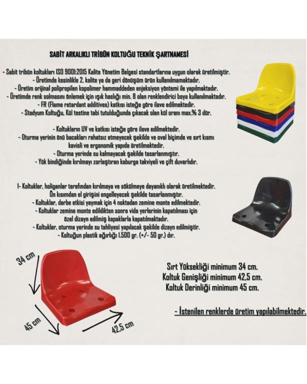 ⭐ “STM‑01 sırtlıklı stadyum koltuğu, dört bağlantılı modüler tasarımıyla tribün, stadyum ve spor salonu kullanımları için ideal çözümdür. Plastik gövdesi ve renk çeşitliliği (beyaz, kırmızı, mavi, yeşil, sarı, siyah) sayesinde estetik ve dayanıklı yapı sunar. Koltuk genişliği 43,5 cm, oturma derinliği 45 cm ve sırt yüksekliği 34 cm olarak tasarlanmıştır. 4 vidalı montaj sistemi ile sabit bağlantılıdır.”