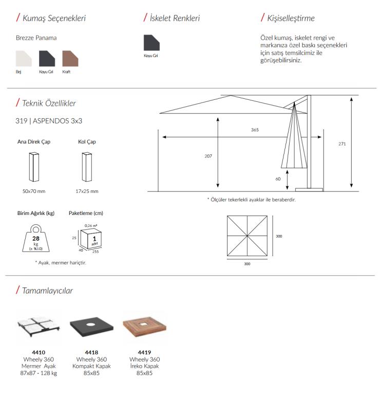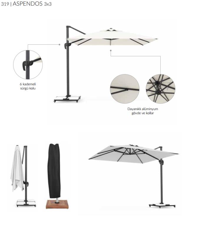 🎯 Şıklığı ve fonksiyonelliği bir arada sunan Aspendos Yandan Kollu Şemsiye, açık alanlarınızda konforu ve gölgeyi en üst düzeye çıkarır. 3x3 metre ölçüsündeki geniş gölgelik alanı sayesinde bahçe, teras, havuz kenarı veya kafe gibi açık alanlarda güneşin etkisinden korunarak keyifli vakit geçirmenizi sağlar.