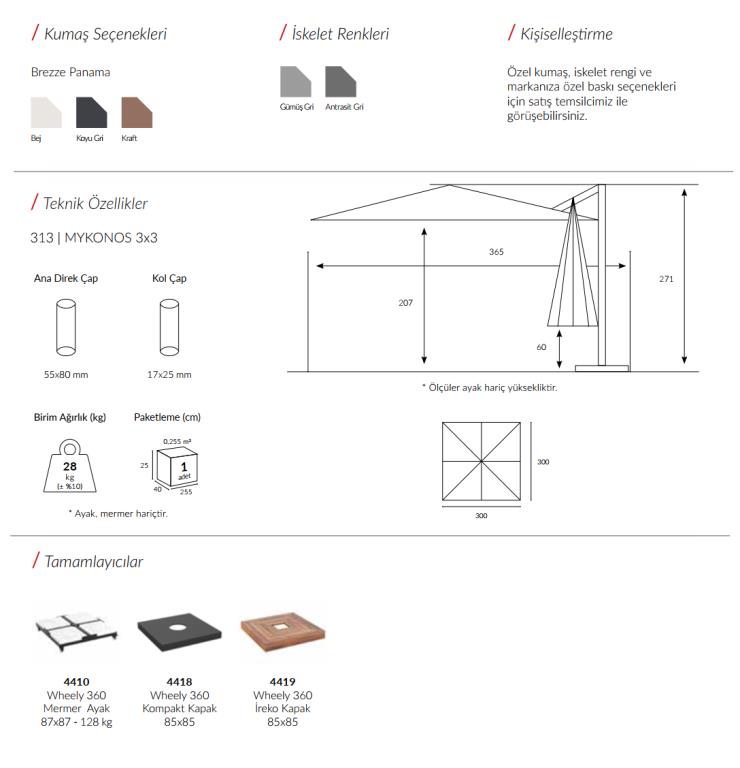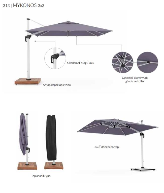 🌞 3x3 Myknos Yandan Kollu Şemsiye, modern tasarımı ve sağlam yapısıyla dış mekanlarınızda şıklığı ve işlevselliği bir araya getirir. Yandan kollu yapısı sayesinde geniş gölgelik alan sunar ve yerden tasarruf sağlar. 3x3 metre boyutları ile özellikle bahçe, teras, kafe ve otel gibi alanlarda ideal kullanım sunar.