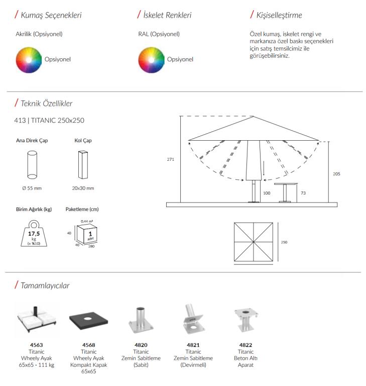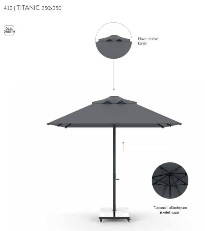 🌈 Yağmurun keyfini çıkarmak hiç bu kadar zarif olmamıştı! 250x250 ölçülerindeki Titanic model bahçe şemsiyesi, geniş gölgelik alanı ve sağlam yapısıyla dış mekanlarda konforunuzu artırır. Balkon, teras, kafe ve restoran gibi açık alanlar için mükemmel bir tercih.